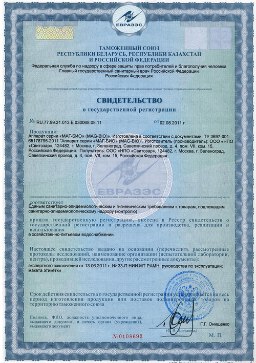 - Свидетельство о государственной регистрации в Таможенном союзе республики Беларусь, республики Казахстан и Российской Федерации;